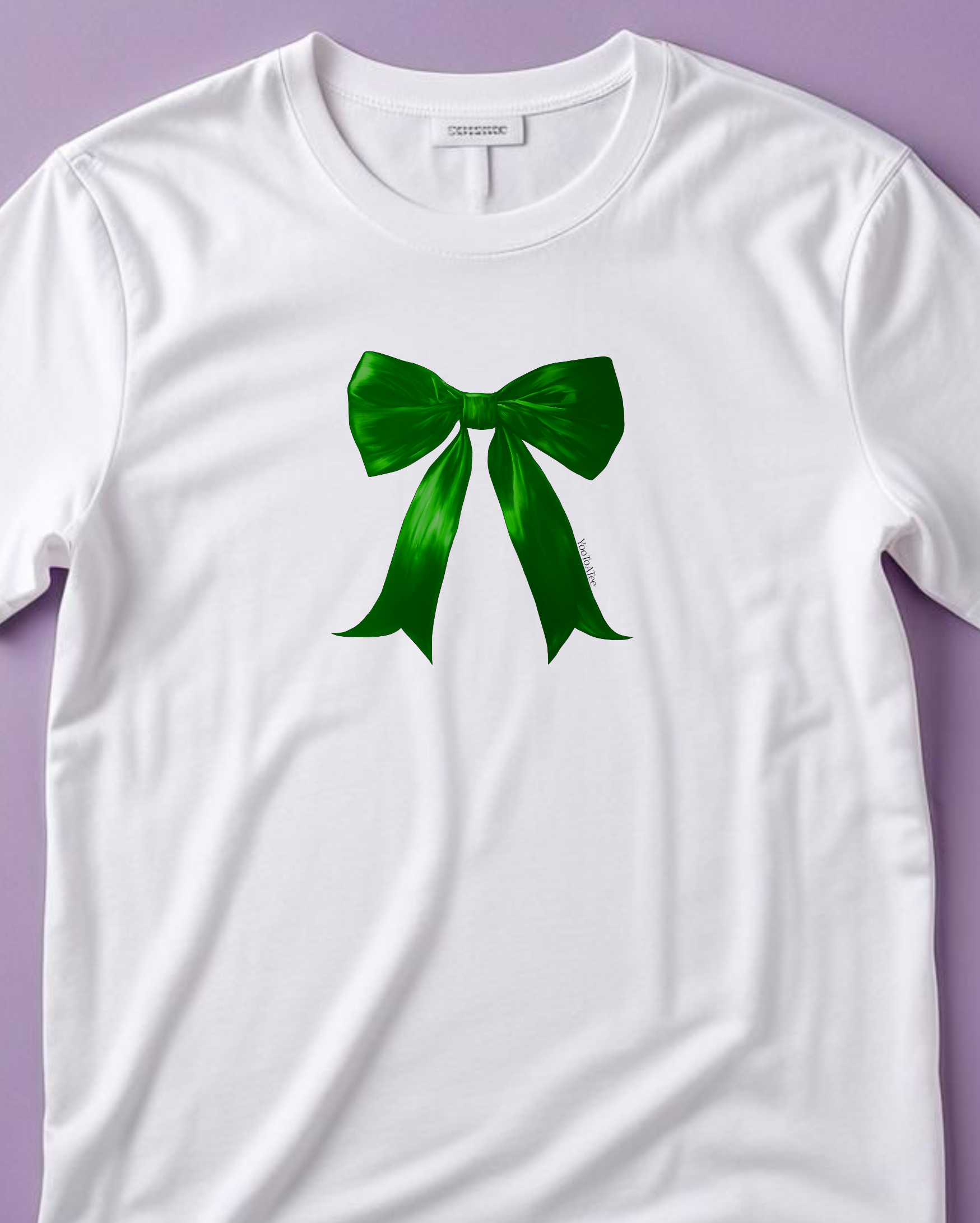 Elevate your holiday wardrobe with the Emerald Noel Classic Tee, featuring a festive green sparkly bow accented with subtle glitter for a touch of seasonal sparkle. Crafted from luxury organic fabric, this vegan t-shirt offers exceptional comfort and sustainability. Its timeless white design allows for versatile styling—perfect for dressing up or down throughout the festive season. Embrace both style and ethical quality in this elegant Christmas classic.